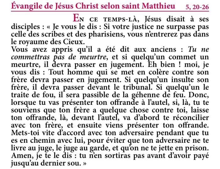 Évangile de Jésus-Christ selon saint Matthieu 5,20-26.