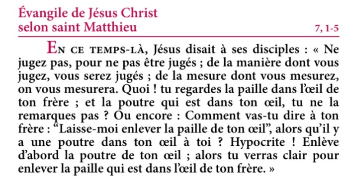 Quoi ! tu regardes la paille dans l’œil de ton frère ; et la poutre qui est dans ton œil, tu ne la remarques pas ?