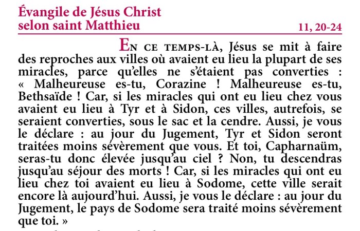 « Malheureuse es-tu, Corazine ! Malheureuse es-tu, Bethsaïde ! Car, si les miracles qui ont eu lieu chez vous avaient eu lieu à Tyr et à Sidon, ces villes, autrefois, se seraient converties sous le sac et la cendre.