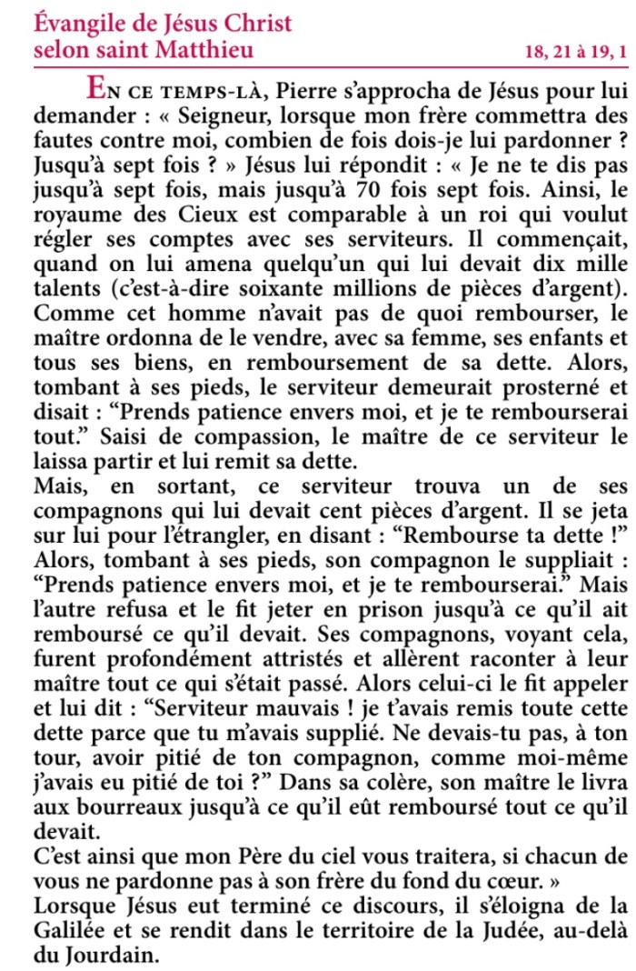 Évangile de Jésus-Christ selon saint Matthieu 18,21-35.19,1.