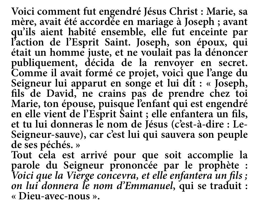 Comme il avait formé ce projet, voici que l’ange du Seigneur lui apparut en songe et lui dit : « Joseph, fils de David, ne crains pas de prendre chez toi Marie, ton épouse, puisque l’enfant qui est engendré en elle vient de l’Esprit Saint ;
