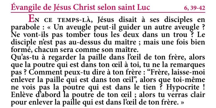 Comment peux-tu dire à ton frère : “Frère, laisse-moi enlever la paille qui est dans ton œil”, alors que toi-même ne vois pas la poutre qui est dans le tien ? Hypocrite ! Enlève d’abord la poutre de ton œil ; alors tu verras clair pour enlever la paille qui est dans l’œil de ton frère. »
