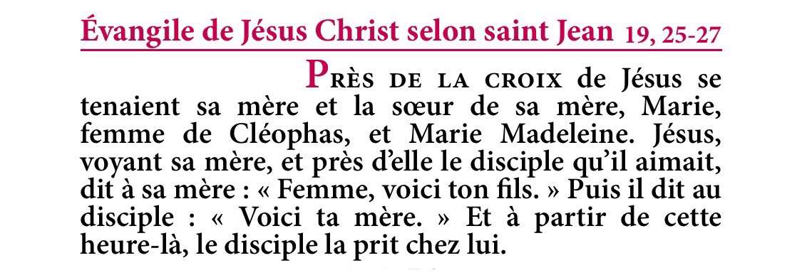 « Jésus, voyant sa mère, et près d’elle le disciple qu’il aimait, dit à sa mère : ‘Femme, voici ton fils.' » Jn 19