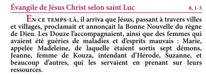 En ce temps-là, il arriva que Jésus, passant à travers villes et villages, proclamait et annonçait la Bonne Nouvelle du règne de Dieu. Les Douze l’accompagnaient, ainsi que des femmes qui avaient été guéries de maladies et d’esprits mauvais : Marie, appelée Madeleine, de laquelle étaient sortis sept démons, Jeanne, femme de Kouza, intendant d’Hérode, Suzanne, et beaucoup d’autres, qui les servaient en prenant sur leurs ressources.