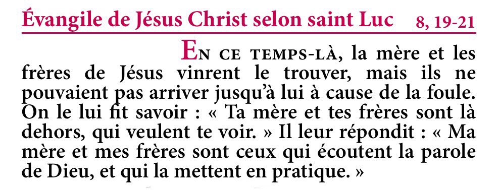 Il leur répondit : « Ma mère et mes frères sont ceux qui écoutent la parole de Dieu et la mettent en pratique. » Lc 8