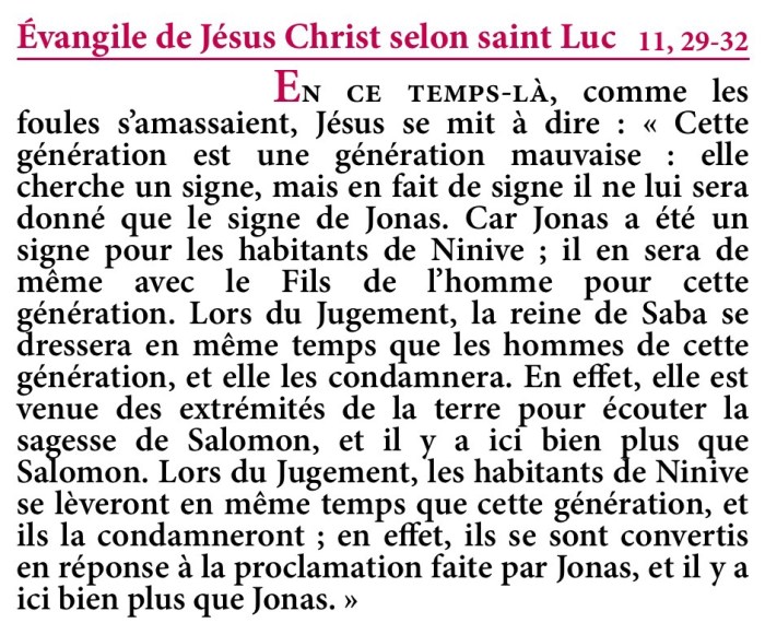 Lors du Jugement, les habitants de Ninive se lèveront en même temps que cette génération, et ils la condamneront ; en effet, ils se sont convertis en réponse à la proclamation faite par Jonas, et il y a ici bien plus que Jonas. »