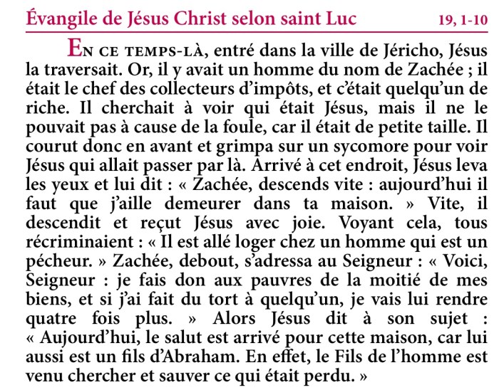 Zachée, debout, s’adressa au Seigneur : « Voici, Seigneur : je fais don aux pauvres de la moitié de mes biens, et si j’ai fait du tort à quelqu’un, je vais lui rendre quatre fois plus. »