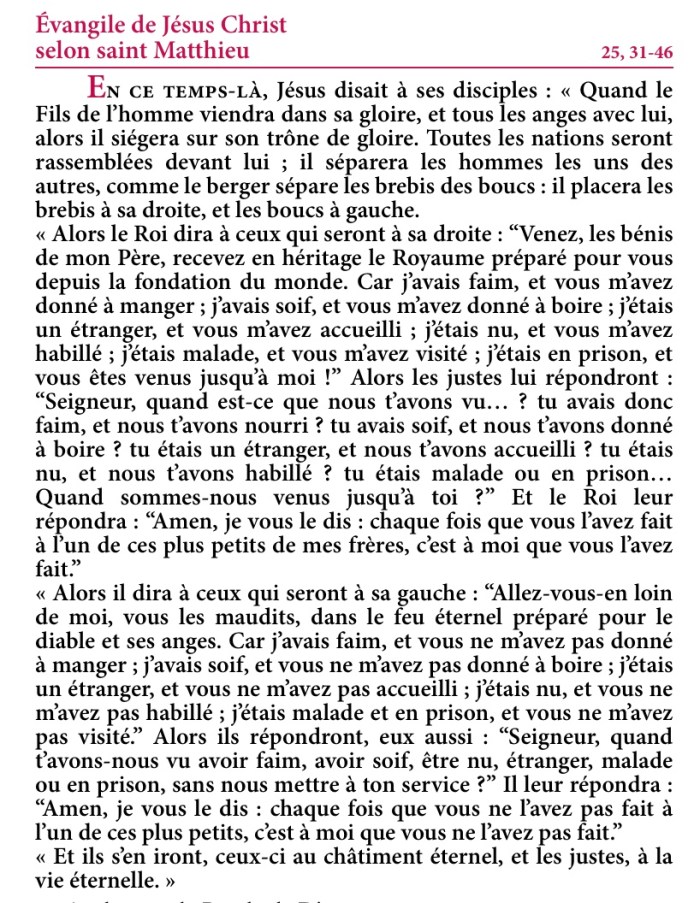 Il leur répondra : “Amen, je vous le dis : chaque fois que vous ne l’avez pas fait à l’un de ces plus petits, c’est à moi que vous ne l’avez pas fait.”