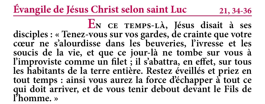 « Tenez-vous sur vos gardes, de crainte que votre cœur ne s’alourdisse dans les beuveries, l’ivresse et les soucis de la vie, et que ce jour-là ne tombe sur vous à l’improviste