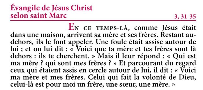 « Celui qui fait la volonté de Dieu, celui-là est pour moi un frère, une sœur, une mère. » Mc 3