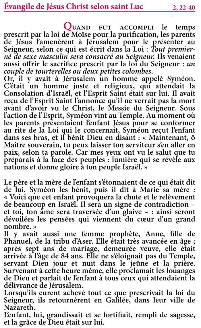 Evangile de la fête de la Présentation du Seigneur au Temple (Chandeleur) – Extrait de la Traduction Liturgique de la Bible – © AELF, Paris