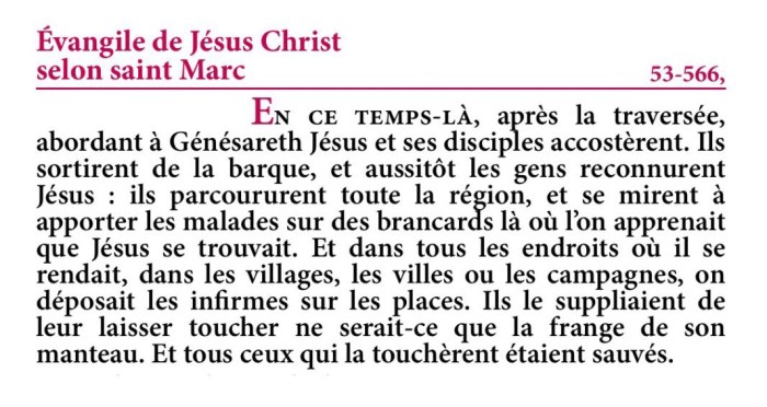 Et dans tous les endroits où il se rendait, dans les villages, les villes ou les campagnes, on déposait les infirmes sur les places. Ils le suppliaient de leur laisser toucher ne serait-ce que la frange de son manteau. Et tous ceux qui la touchèrent étaient sauvés.