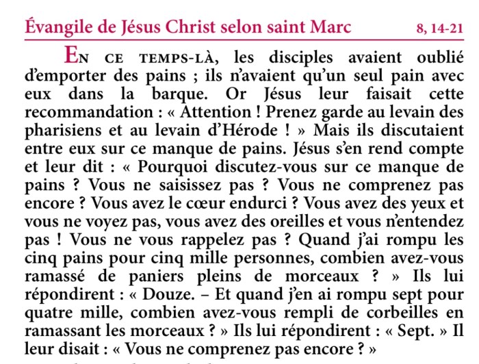 En ce temps-là, les disciples avaient oublié d’emporter des pains ; ils n’avaient qu’un seul pain avec eux dans la barque.