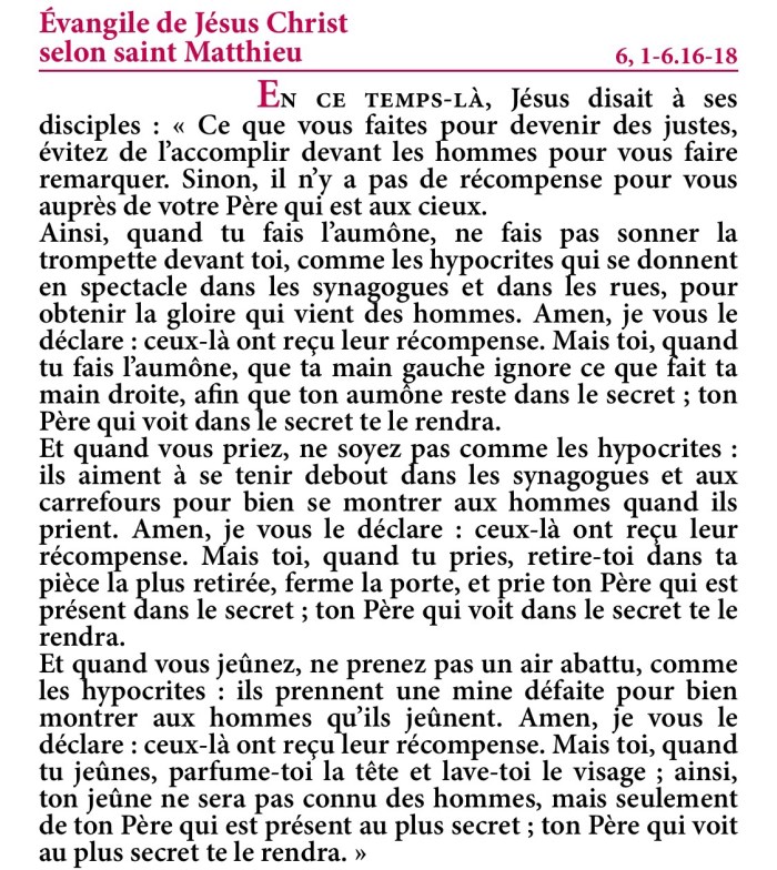 Evangile du mercredi des cendres – Extrait de la Traduction Liturgique de la Bible – © AELF, Paris