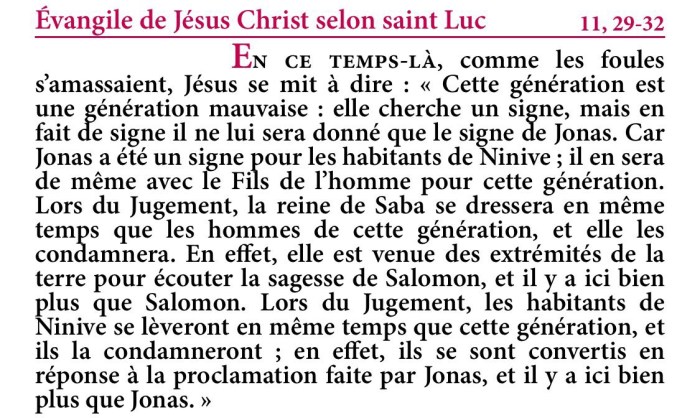 « Car Jonas a été un signe pour les habitants de Ninive ; il en sera de même avec le Fils de l’homme pour cette génération. » Lc 11, 29-32