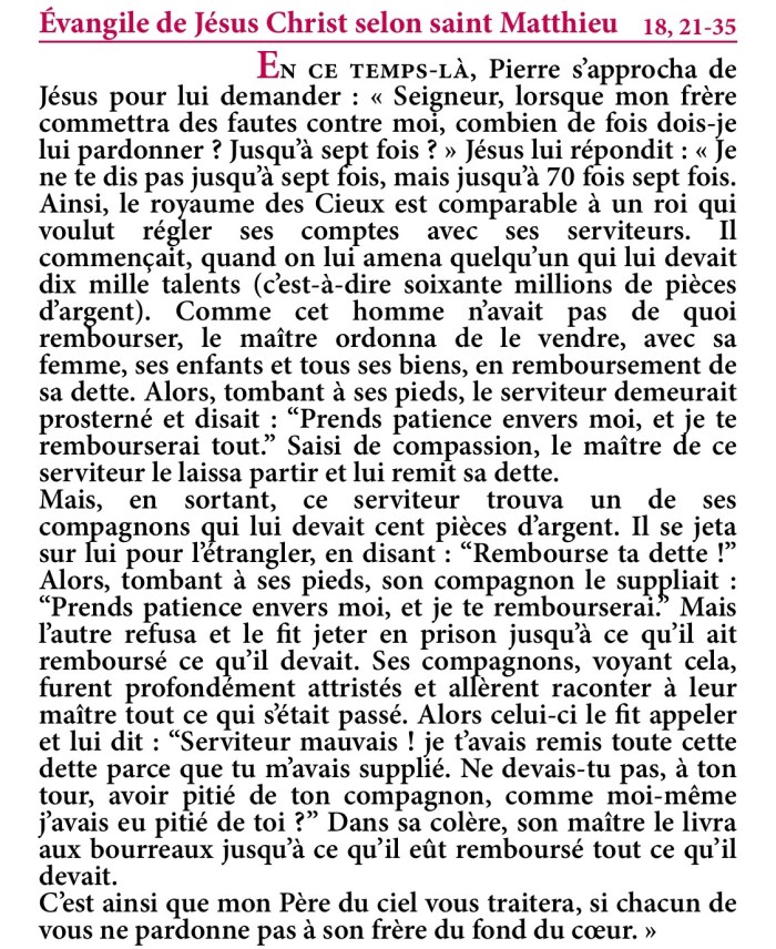 En ce temps-là, Pierre s’approcha de Jésus pour lui demander : « Seigneur, lorsque mon frère commettra des fautes contre moi, combien de fois dois-je lui pardonner ? Jusqu’à sept fois ? »