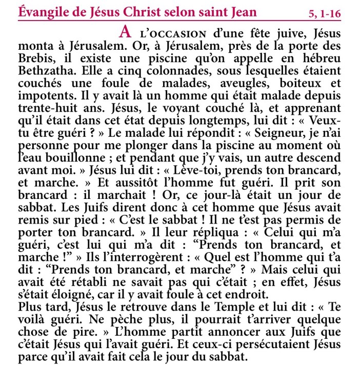 Et aussitôt l’homme fut guéri. Il prit son brancard : il marchait ! Or, ce jour-là était un jour de sabbat.