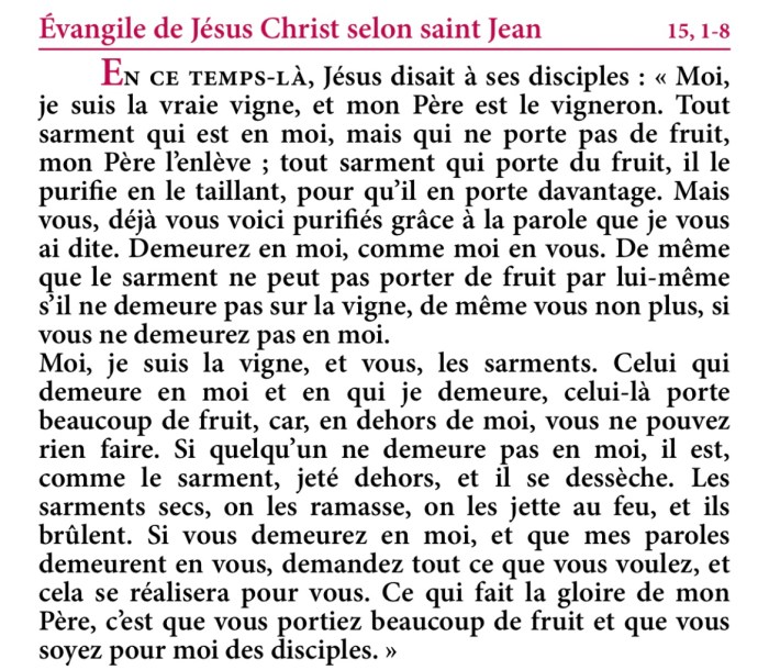 Demeurez en moi, comme moi en vous. De même que le sarment ne peut pas porter de fruit par lui-même s’il ne demeure pas sur la vigne, de même vous non plus, si vous ne demeurez pas en moi.