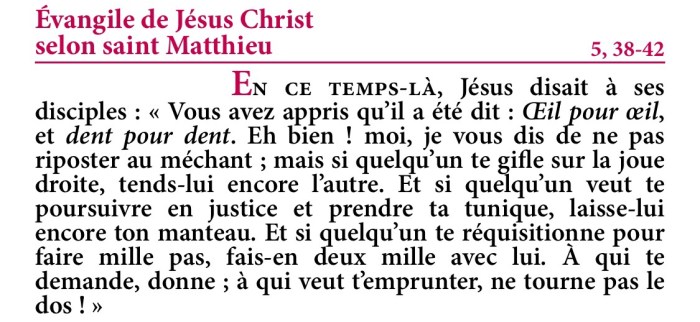 Eh bien ! moi, je vous dis de ne pas riposter au méchant ; mais si quelqu’un te gifle sur la joue droite, tends-lui encore l’autre.
