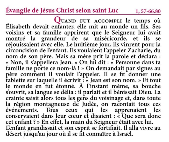 Evangile de la Nativité de saint Jean Baptiste – Extrait de la Traduction Liturgique de la Bible – © AELF, Paris