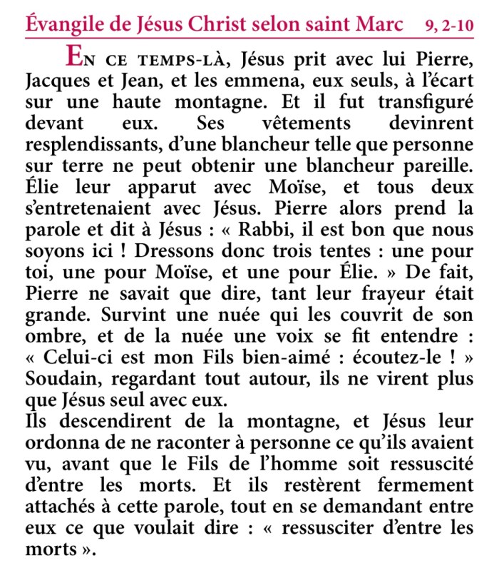 Evangile de la fête de la Transfiguration – Extrait de la Traduction Liturgique de la Bible – © AELF, Paris