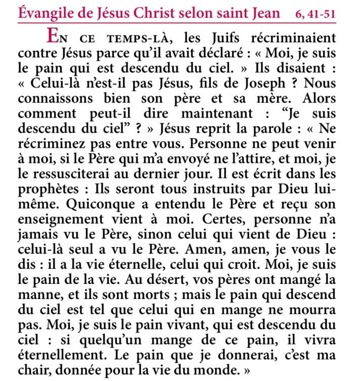 Moi, je suis le pain vivant, qui est descendu du ciel : si quelqu’un mange de ce pain, il vivra éternellement. Le pain que je donnerai, c’est ma chair, donnée pour la vie du monde. »