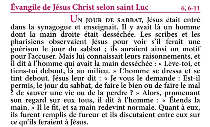 Jésus leur dit : « Je vous le demande : Est-il permis, le jour du sabbat, de faire le bien ou de faire le mal ? de sauver une vie ou de la perdre ? »