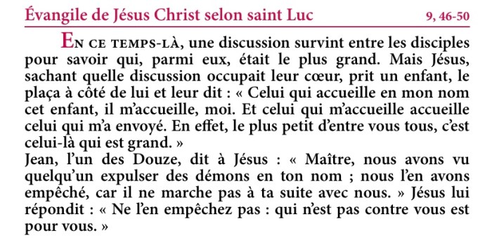 Mais Jésus, sachant quelle discussion occupait leur cœur, prit un enfant, le plaça à côté de lui et leur dit : « Celui qui accueille en mon nom cet enfant, il m’accueille, moi. Et celui qui m’accueille accueille celui qui m’a envoyé. En effet, le plus petit d’entre vous tous, c’est celui-là qui est grand. »